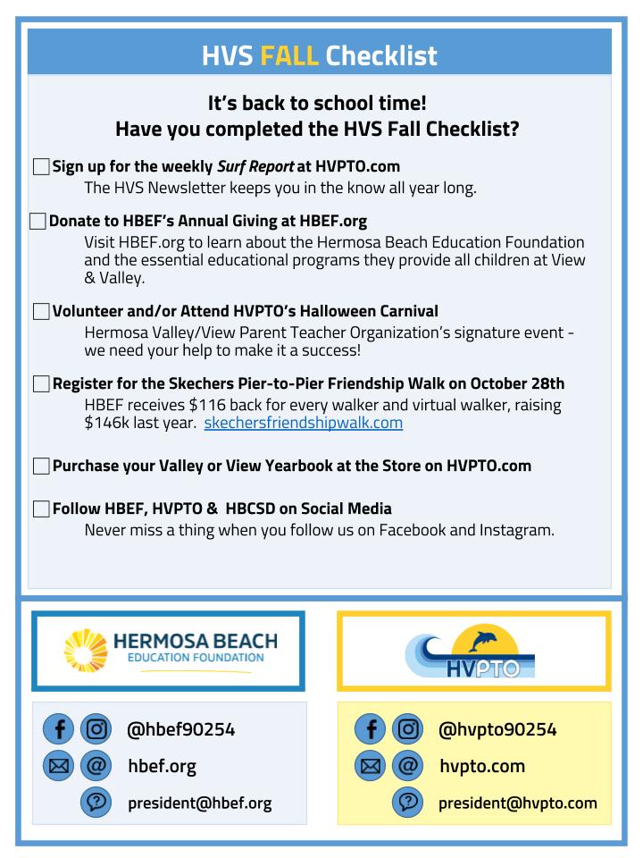 The start of the school year can be crazy!  Use the checklist below to get you going on HVPTO & HBEF events, news and fundraisers!