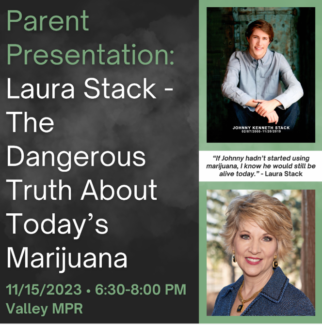 Parents are invited to attend a presentation by Laura Stack, the Founder & CEO of the nonprofit, Johnny’s Ambassadors Youth Marijuana Prevention and author of “The Dangerous Truth About Today’s Marijuana,” on Wednesday, November 15, from 6:30-8:00 PM in the Valley MPR.
