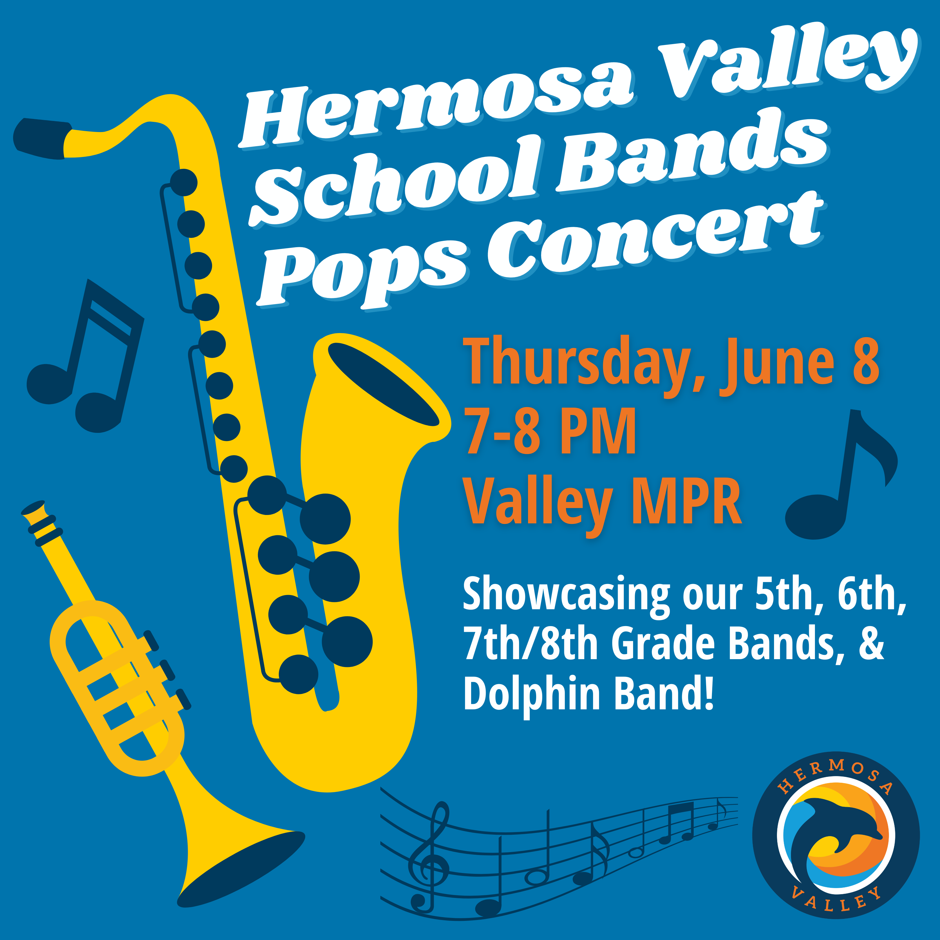 The Hermosa Valley School Bands Pops Concert is on Thursday, June 8, from 7-8 PM, in the Valley MPR. Our 5th, 6th, 7th/8th Grade Bands, & Dolphin Band will be performing.