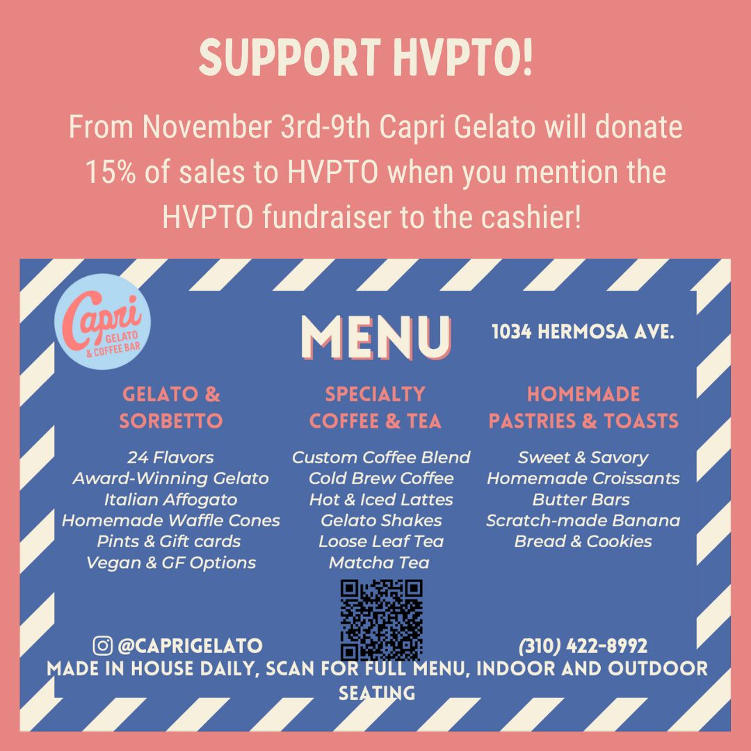HVPTO is proud to partner with Capri Gelato & Coffee Bar for a week-long YUMraiser!  And, wouldn’t you know… that week coincides with our week of minimum days for Parent-Teacher conferences!  Afternoon treat, anyone?
