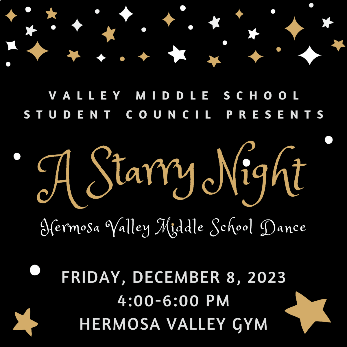 The Middle School Student Council invites our 6th, 7th, & 8th graders to A Starry Night Valley Middle School Dance on